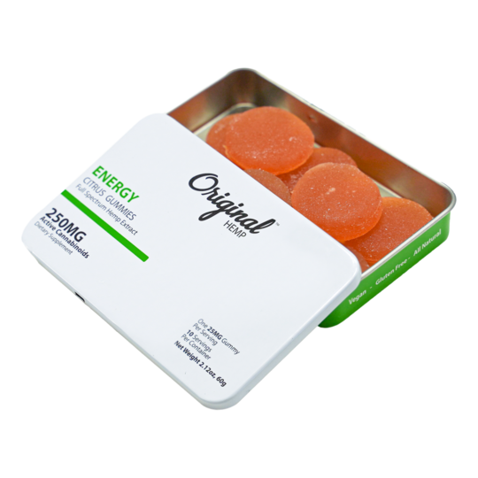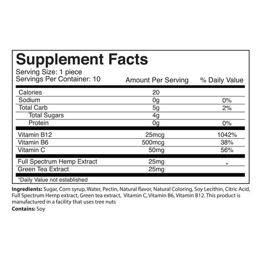 Original Hemp Energy gummies combine the power of Full Spectrum Hemp Extract, with the energizing properties of Green Tea Extract, Vitamin B12, B6 and Vitamin C to give you the burst of vitamin and nutrients you need to take on the day and stay focused. Our Energy gummies are all-natural, vegan, with no artificial flavors or colors. Energy gummies give you 25mg of beneficial cannabinoids and natural supplement ingredients that make you feel ready to handle anything that the day brings.