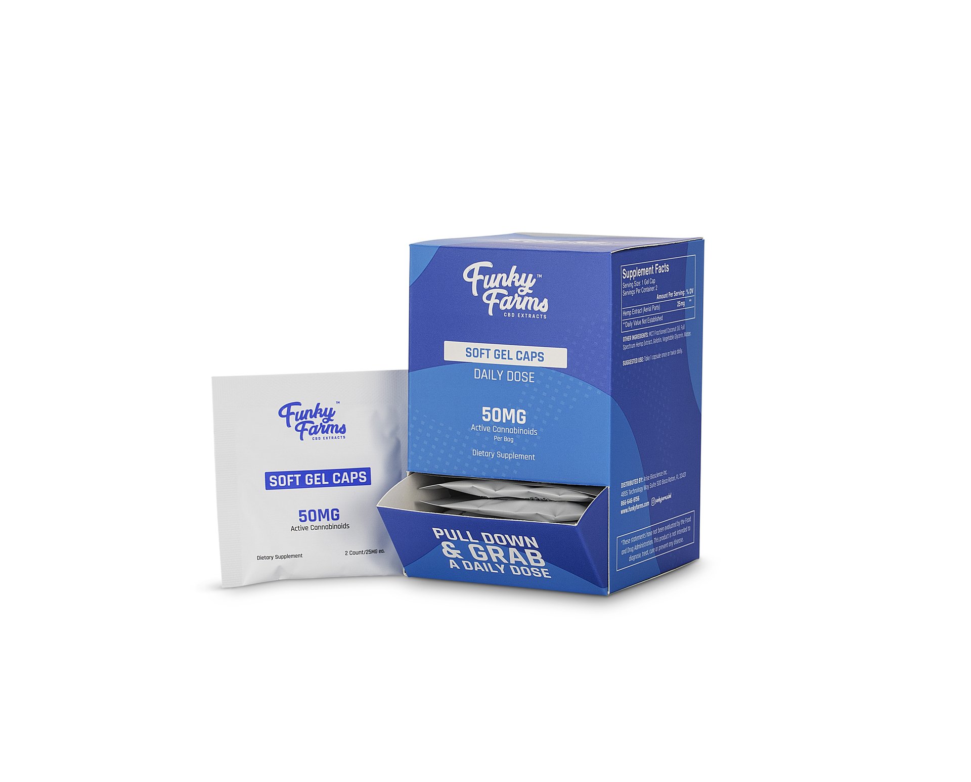 Funky Farms Daily Dose 50mg Gel Caps are conveniently dosed CBD capsules for use on the go and easy dosing.